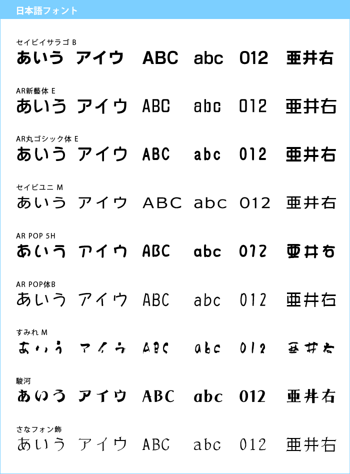 サンプル書体を参考に、書体・スタイルを選んでお好きな文字をプリントする事ができます。